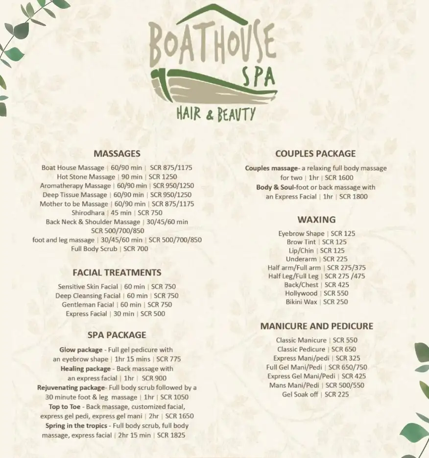 Au Boat House Spa, nous sommes fiers de proposer une sélection de soins exclusifs inspirés des merveilles marines environnantes. Chaque soin est soigneusement conçu pour exploiter les pouvoirs curatifs de la mer, vous laissant rajeuni de la tête aux pieds. Nos thérapeutes se consacrent à créer une expérience de spa qui vous transporte au paradis.