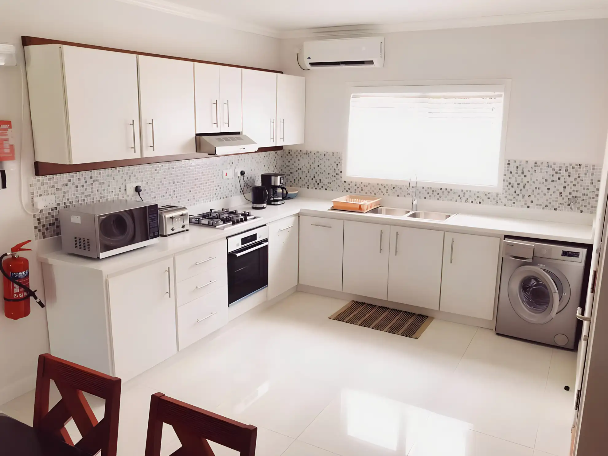 Bénéficiez d'un confort ultime avec nos lits confortables de premier ordre, d'une longueur supplémentaire pour plus de luxe. Restez au frais avec des ventilateurs de plafond et des chambres entièrement climatisées. La chambre principale offre un lit queen, une salle de bains privative et un coffre-fort pour ordinateur portable, tandis que la deuxième chambre comprend des lits jumeaux et une salle de bains séparée.