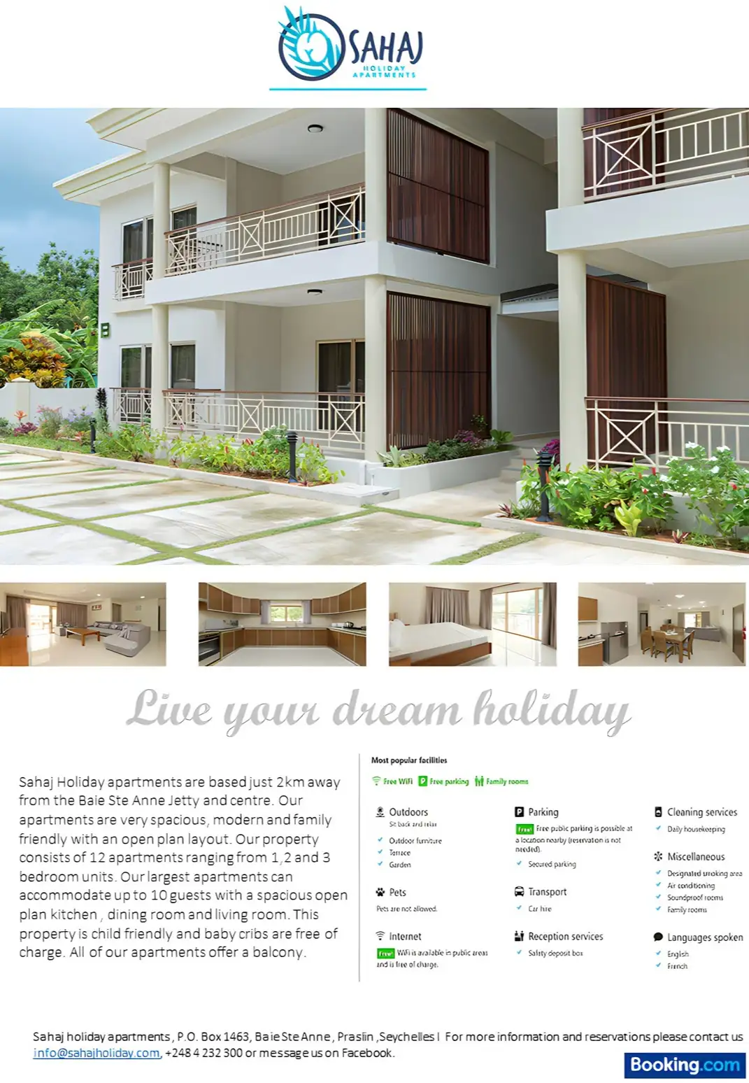 Üdvözöljük a Sahaj Holiday Apartments-ben, egy kellemes, önellátó szálláshelyen, amely Baie Ste Anne-ben, Praslin szigetén található, mindössze 2 km-re a mólótól és a városközponttól. Kiváló elhelyezkedésünk ideális választássá teszi minket a kényelmet és a kényelemre vágyó utazók számára.